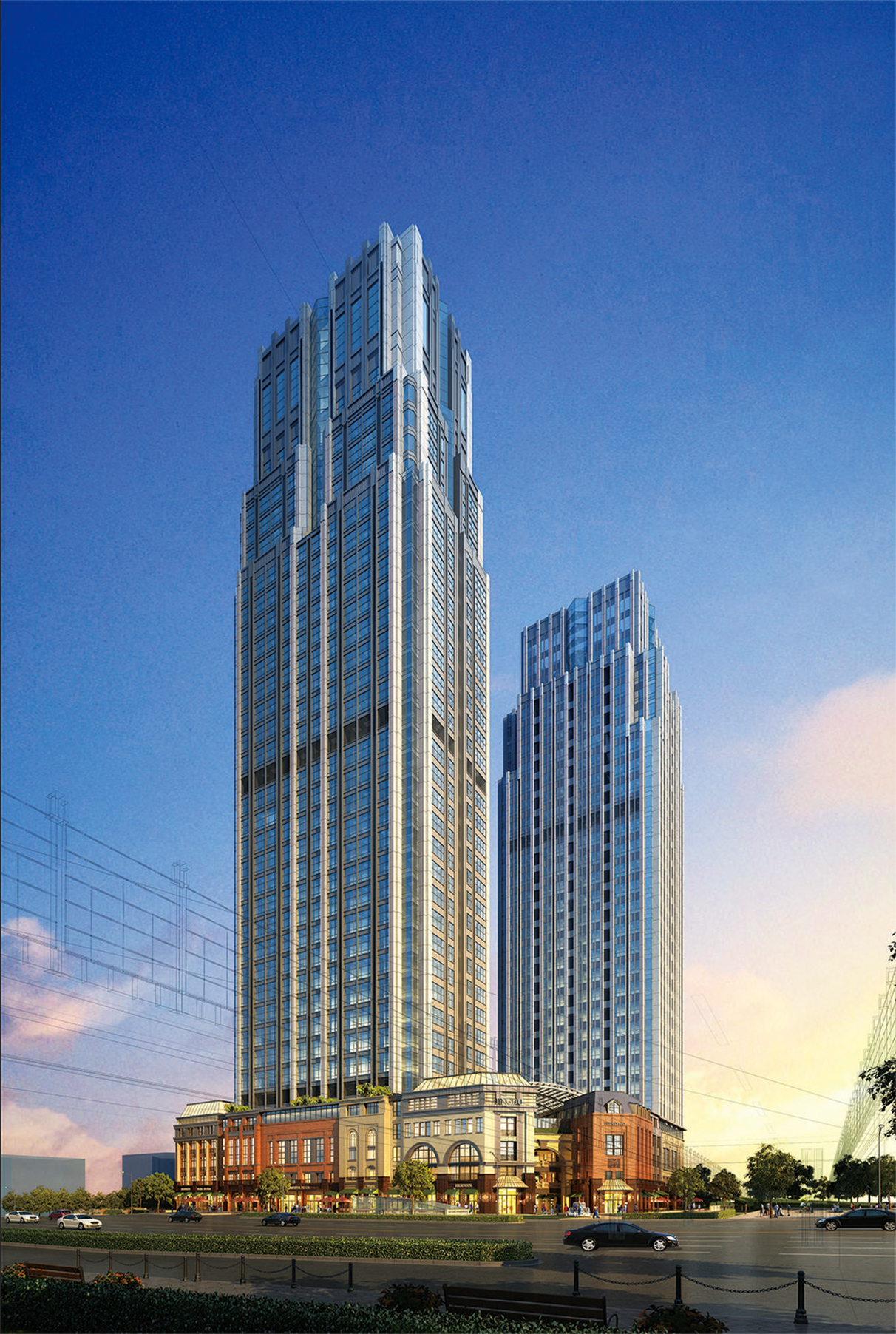 項目位于福建省莆田市東園西路東北側(cè),北面與西山小區(qū)相鄰,距離市中心約1.9千米。項目總用地面積約2.2萬平方米,總建筑面積為14.3萬平方米。整個綜合體由三棟辦公樓(高度分別為180米、150米和100米)和5層高的商業(yè)裙房組成。