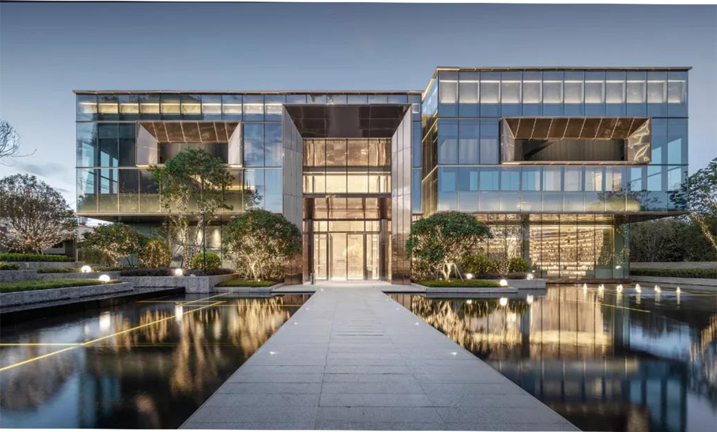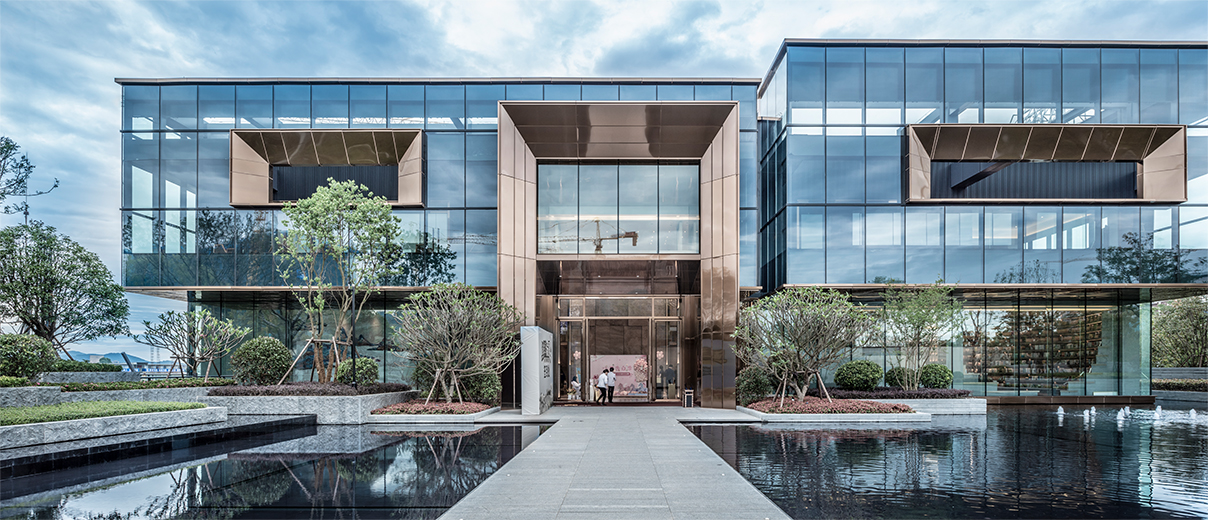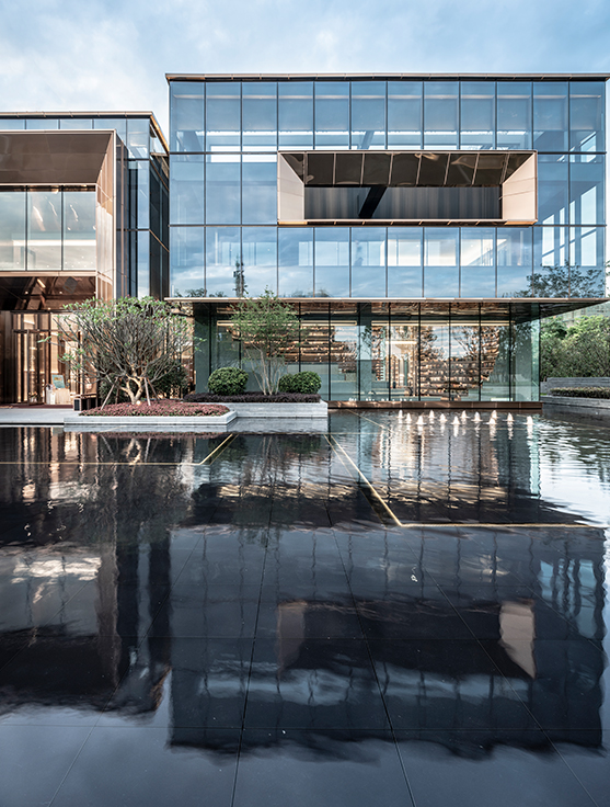 建筑的二層體量作為一個(gè)整體坐落于一層體量之上,首層采用具有高透性的超白玻,使二層體量遠(yuǎn)遠(yuǎn)望去仿佛懸浮于城市中的玻璃盒子。同時(shí)首層后退引入鏡面水景觀,首層采用的玻璃材質(zhì)使建筑與水景融為一體;沿主入口方向,由香檳色鋼板材質(zhì)包裹的主入口門頭符合訪客尺度,成為建筑亮點(diǎn)的同時(shí),還增加了引導(dǎo)性;建筑首層與二層的相互疊合,一氣呵成,形成有著多重感官體驗(yàn)的城市空間。