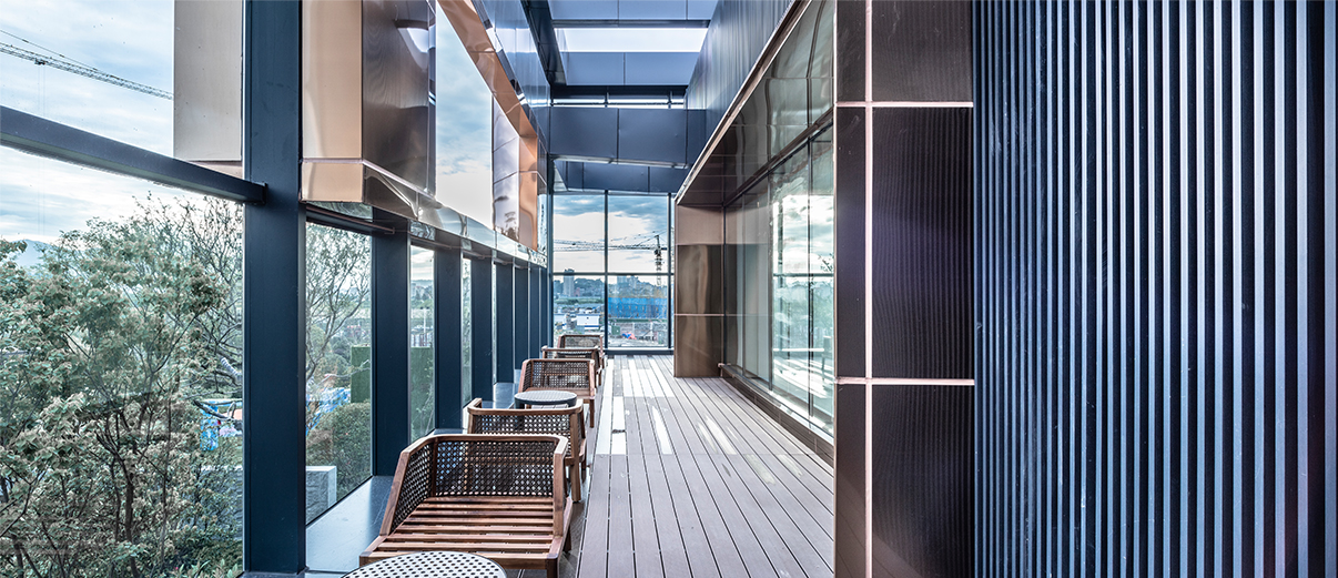 建筑二層的出挑部分的露臺(tái)作為室內(nèi)部分與城市的交流空間,結(jié)合玻璃幕墻,成為了放松遠(yuǎn)眺的不二之選。