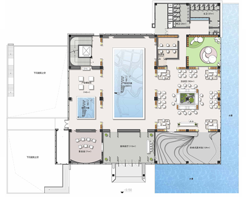 地下一層設(shè)施宴會(huì)廳及泳池,健身設(shè)施等,可以用來滿足不同訪客的需求,其次設(shè)置內(nèi)庭院與之相接,供訪客休憩,私密性好,有悠然自得之感。