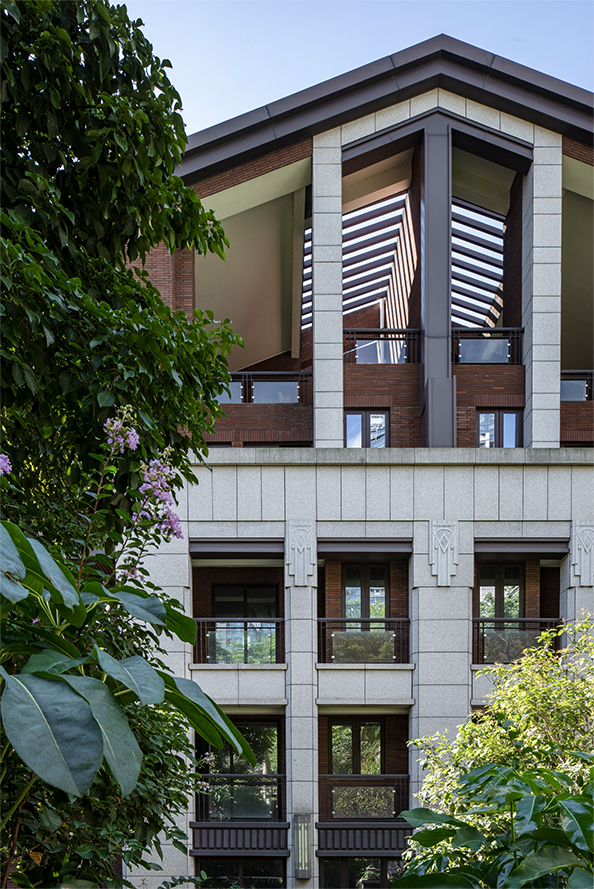 別墅區(qū)外立面選用"賴特草原風格",厚重的石材基座、磚紅色條磚、大尺度外挑的四坡頂均是風格重要的建筑語言??紤]到項目都市核心區(qū)域,立面設計中在風格基礎上多增加了建筑細部的處理,檐口的細部、檐底的木飾面、基座的石材細節(jié),讓"草原風格"別墅狂野的個性有所收斂。