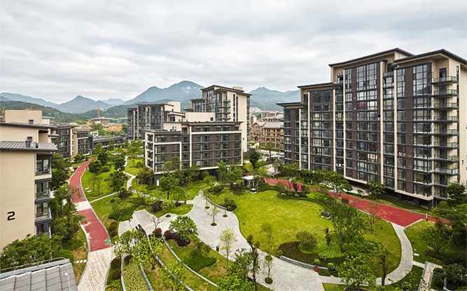 在規(guī)劃設計中,建筑沿基地的周邊布置,對外充分親近南邊景觀與北側(cè)山景,對內(nèi)則圍合成一個超大尺度的內(nèi)向的綠化花園空間。