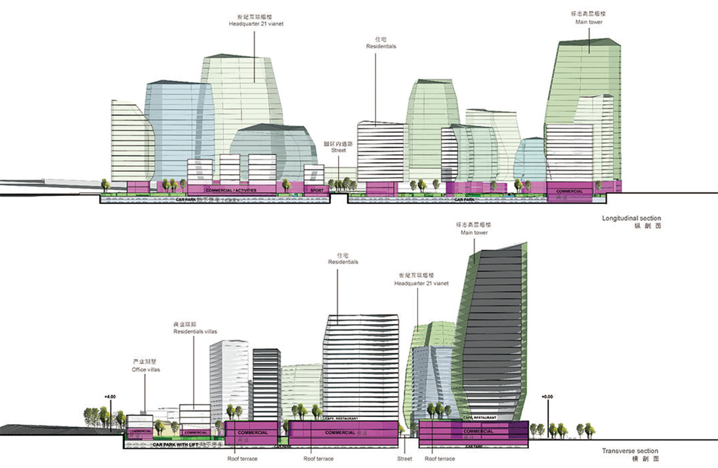 HCA與法國JFA建筑事務所合作完成了佛山智聯(lián)花園的概念規(guī)劃設計。該項目位于佛山市禪城區(qū)城西工業(yè)園,佛開高速公路東側,東平路北側,是佛山智慧新城開發(fā)的一部分,項目總用地面積12.8萬平方米,功能包括辦公樓、企業(yè)獨棟、商業(yè)設施和住宅,總建筑面積約427923平方米。設計選擇了“冰山”的概念來體現(xiàn)場所精神,強調總平面功能布局的清晰性和邏輯性,強調城市、建筑及空間的形態(tài)與場地的和諧關系。