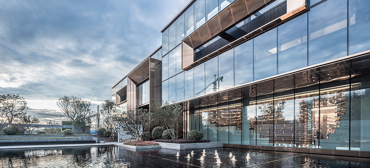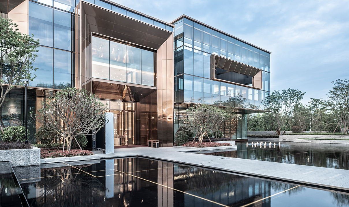 建筑的二層體量作為一個(gè)整體坐落于一層體量之上,首層采用具有高透性的超白玻,使二層體量遠(yuǎn)遠(yuǎn)望去仿佛懸浮于城市中的玻璃盒子。同時(shí)首層后退引入鏡面水景觀,首層采用的玻璃材質(zhì)使建筑與水景融為一體;沿主入口方向,由香檳色鋼板材質(zhì)包裹的主入口門頭符合訪客尺度,成為建筑亮點(diǎn)的同時(shí),還增加了引導(dǎo)性;建筑首層與二層的相互疊合,一氣呵成,形成有著多重感官體驗(yàn)的城市空間。
