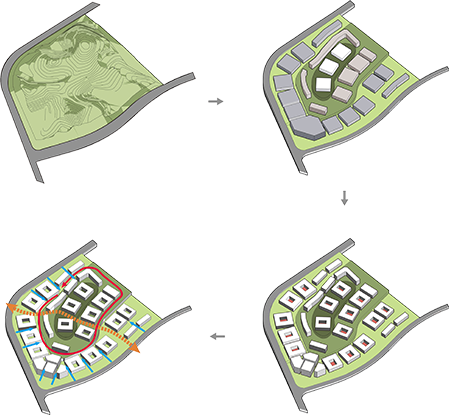 整體規(guī)劃采用大開放小圍合的設(shè)計(jì)理念,開放的山街步道與相對(duì)獨(dú)立的組團(tuán)合院,形成空間的收放韻律。設(shè)計(jì)尊重原始地形,建筑順應(yīng)地勢(shì)而建,由一個(gè)個(gè)標(biāo)準(zhǔn)組團(tuán)及精品民宿區(qū)形成覆蓋山丘的山居聚落,橫向山街與縱向的上山步道,將各組團(tuán)有機(jī)的聯(lián)系在一起,建筑低矮地趴在山丘上,傳承著“覆壓三百余里,隔離天日”的中國(guó)傳統(tǒng)組群院落精神,連續(xù)流動(dòng)且橫向漂浮著。