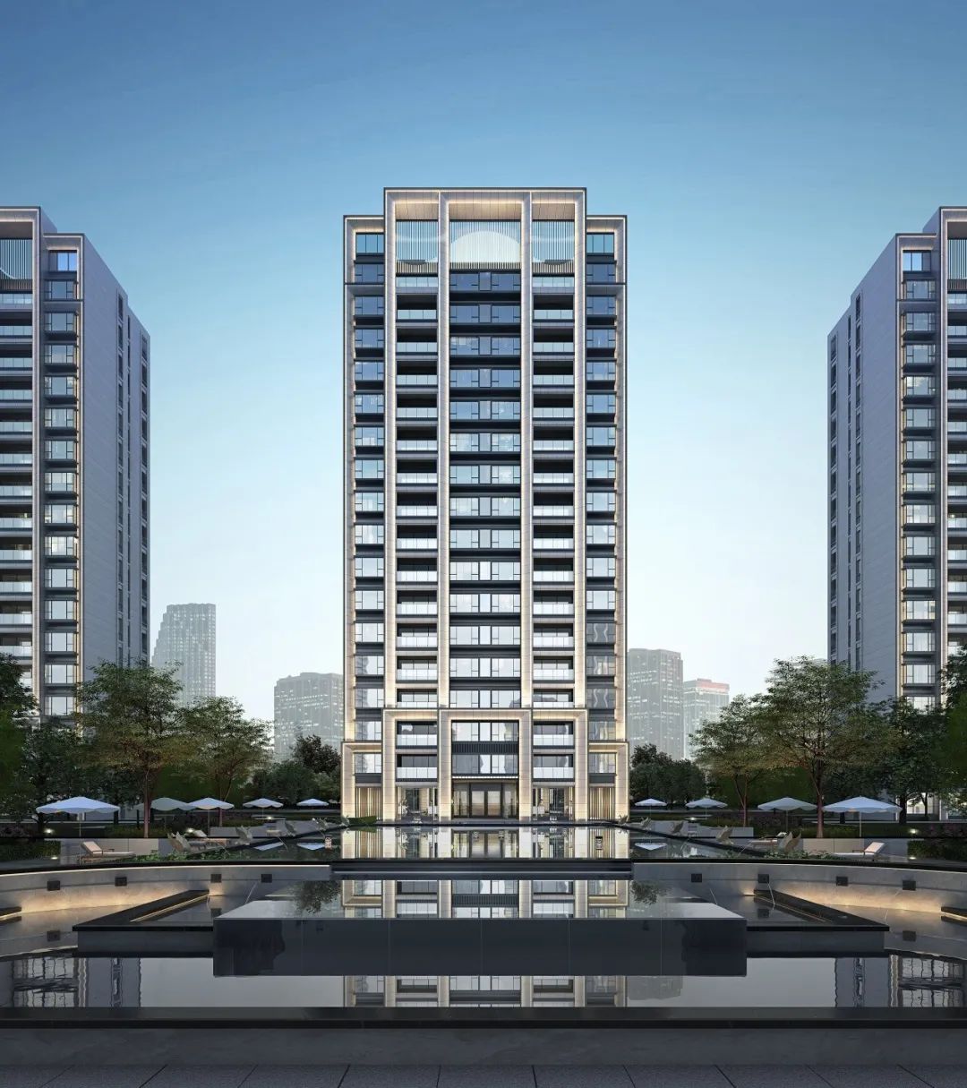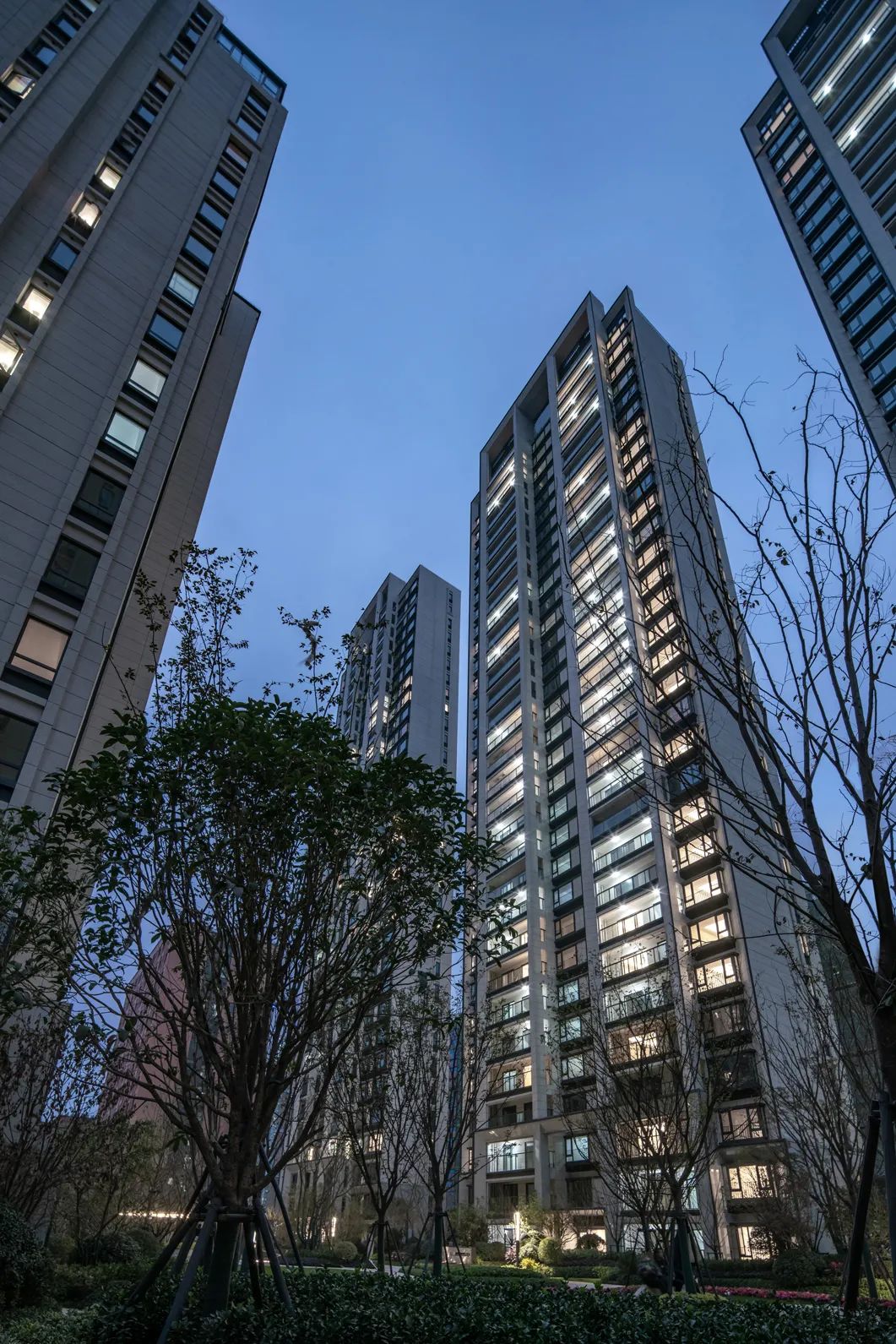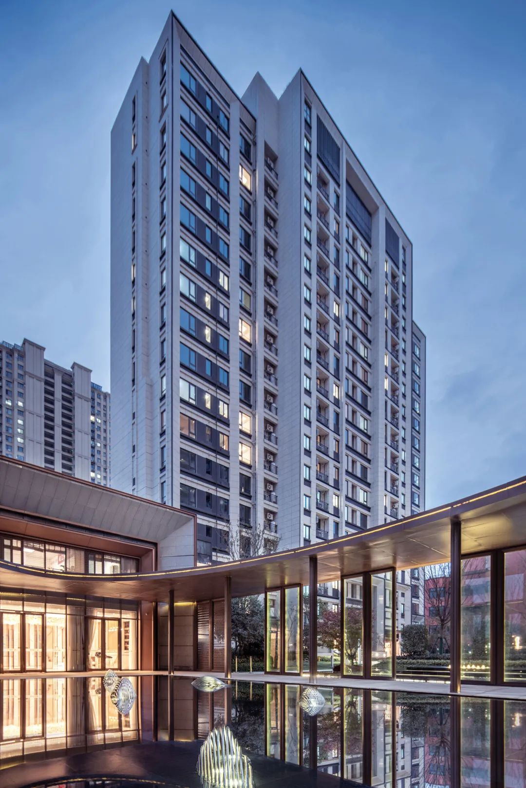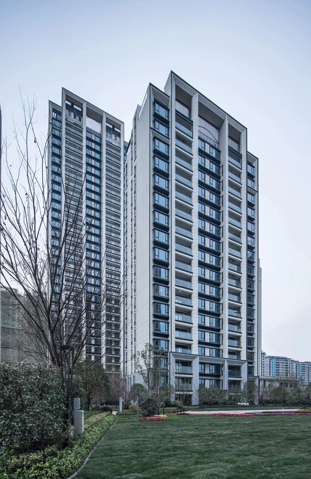 -項目本身受制于成本等因素,大區(qū)立面以土建為主,因此項目中立面的主要線條元素“斜切面”的完成度就成了重要節(jié)點研究對象。我司通過與業(yè)主及幕墻等合作方的多方協(xié)商論證,最終選擇了以成品GRC來取代鋁板幕墻,同時達(dá)到挺拔現(xiàn)代的美感。