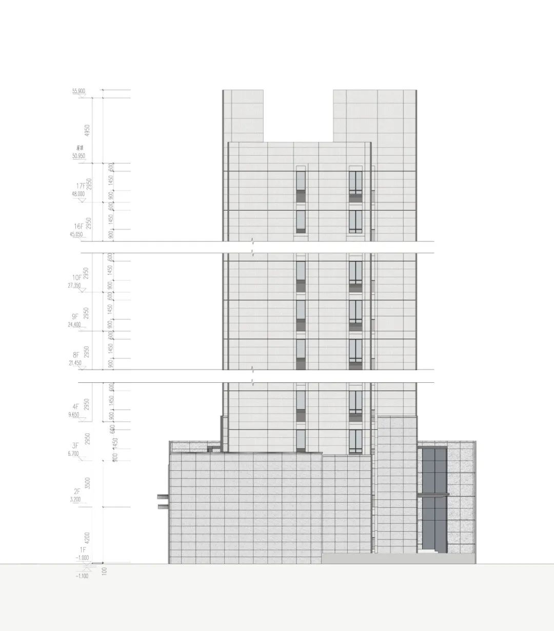 對于建筑立面氣質(zhì)的塑造,設(shè)計團(tuán)隊決心通過簡潔的現(xiàn)代主義設(shè)計語匯為溫州這座歷史悠久的城市展現(xiàn)一個獨特的富有人文精神的未來。試圖抓取城市的時代感,來拓?fù)淞⒚娴默F(xiàn)代意向,在低成本的約束下完成了立面體系的一次創(chuàng)新迭代。