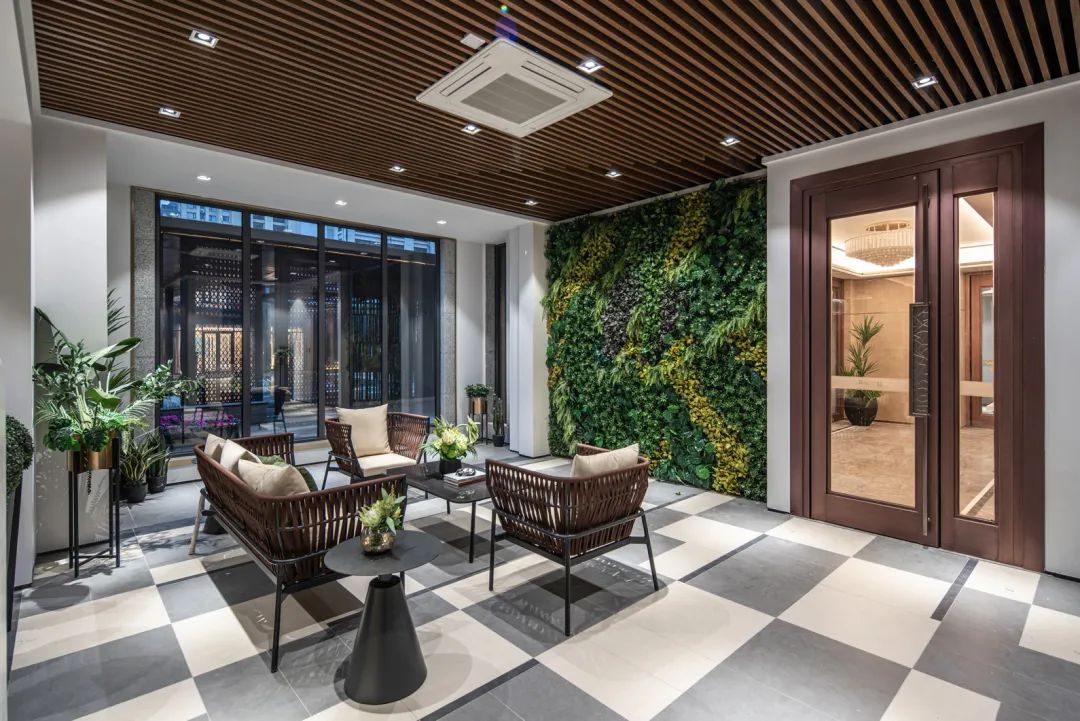 云著的酒店式大堂中空挑高約7米,放大了視覺空間尺度感,給住戶帶來每一次進(jìn)出的尊貴禮遇。