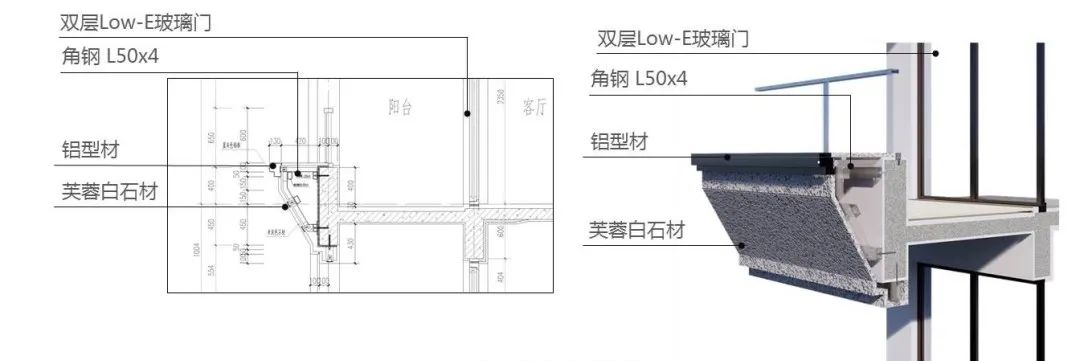 標(biāo)準(zhǔn)斷面設(shè)計中的窗檻墻加玻璃的節(jié)點,陽臺分戶玻璃的設(shè)計研究是提升整個立面觀感的有效投入,同時成本也在可控的范圍內(nèi),團(tuán)隊通過模型及試樣的推敲有效的控制了細(xì)節(jié)的觀感,并以此項目為基準(zhǔn)在后續(xù)的設(shè)計中不斷的迭代優(yōu)化。