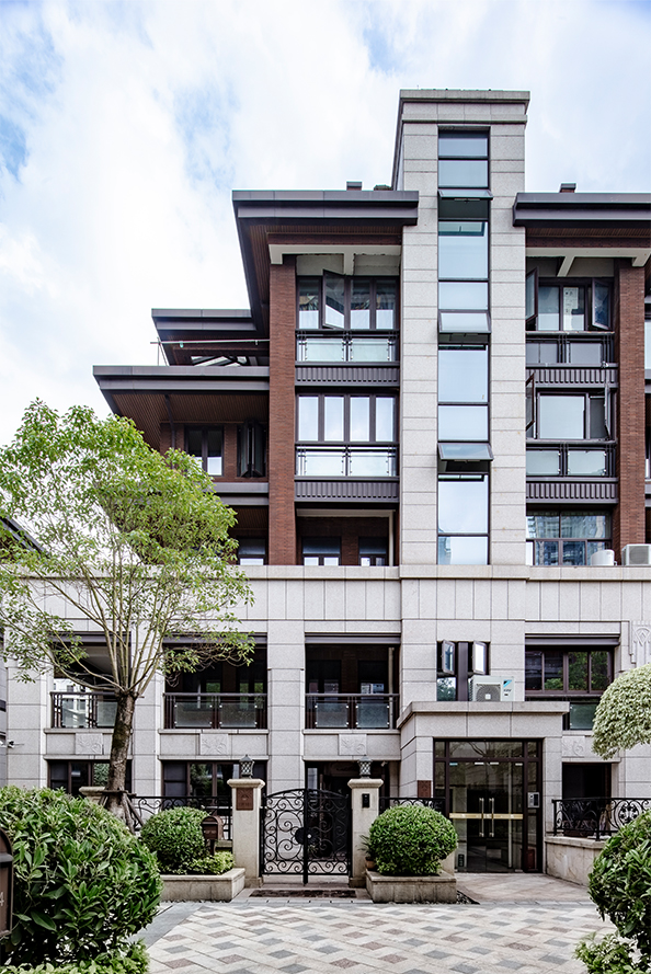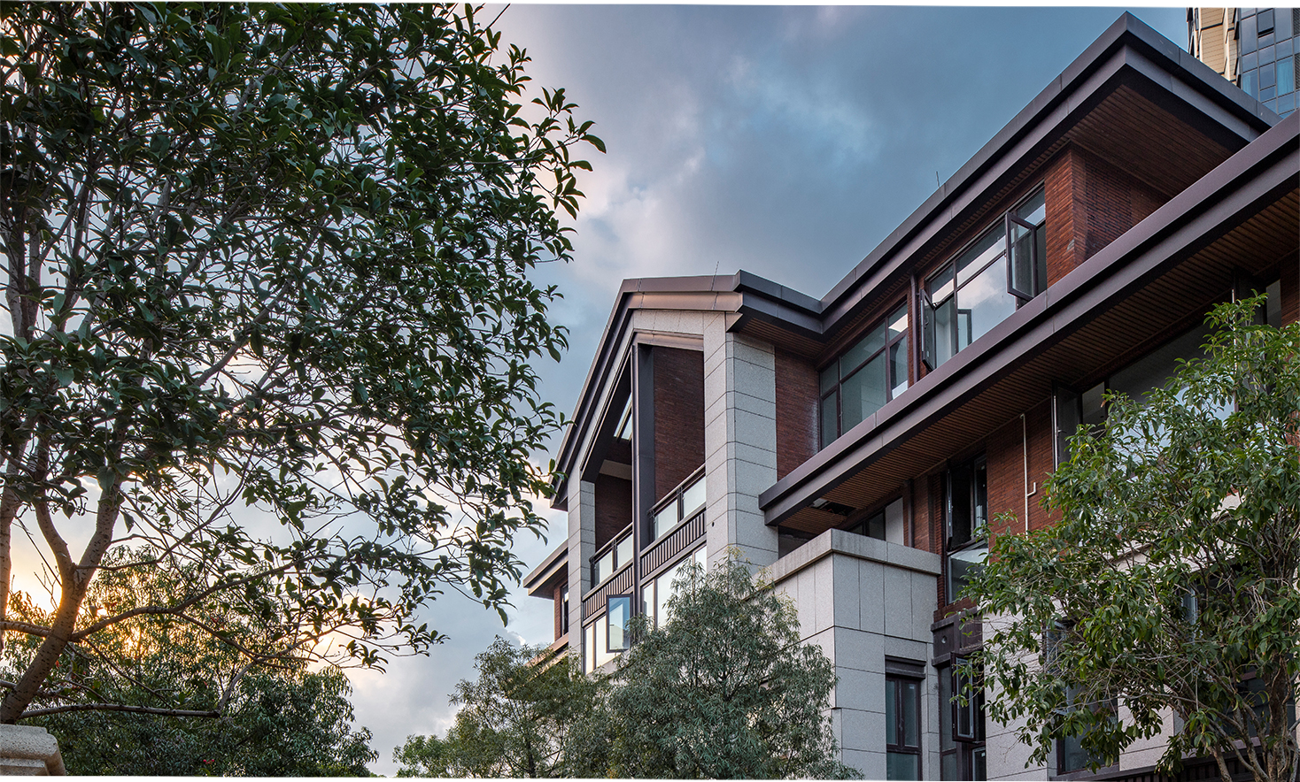 別墅區(qū)外立面選用"賴特草原風格",厚重的石材基座、磚紅色條磚、大尺度外挑的四坡頂均是風格重要的建筑語言??紤]到項目都市核心區(qū)域,立面設計中在風格基礎上多增加了建筑細部的處理,檐口的細部、檐底的木飾面、基座的石材細節(jié),讓"草原風格"別墅狂野的個性有所收斂。