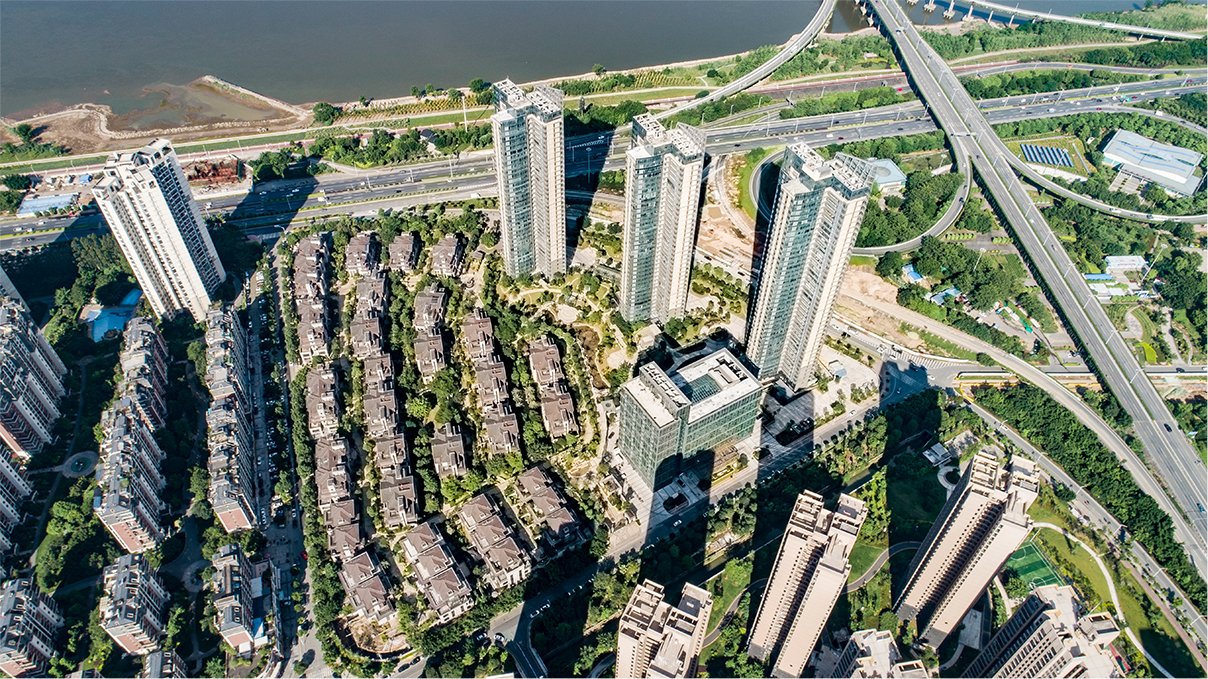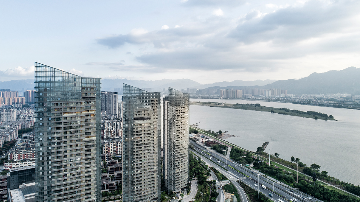 地塊位處橘園洲大橋立交旁,是烏龍江沿線地塊承上啟下的重要節(jié)點。項目從城市設計的角度出發(fā),將4棟高層體量規(guī)整為3棟,向上堆疊,形成130米、140米、150米三棟超高層建筑。建筑外立面采用玻璃結(jié)合陶板的全干掛幕墻系統(tǒng),三角形頂部幕墻的形體設計帶有江畔揚帆的寓意,從建筑表皮及建筑形體兩方面區(qū)別于沿線其他的高層住宅樹立項目的江畔橋頭地標性建筑形象。
